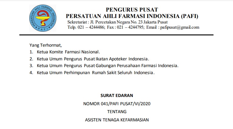 SURAT EDARAN NOMOR 041/PAFI PUSAT/VI/2020 TENTANG ASISTEN TENAGA KEFARMASIAN